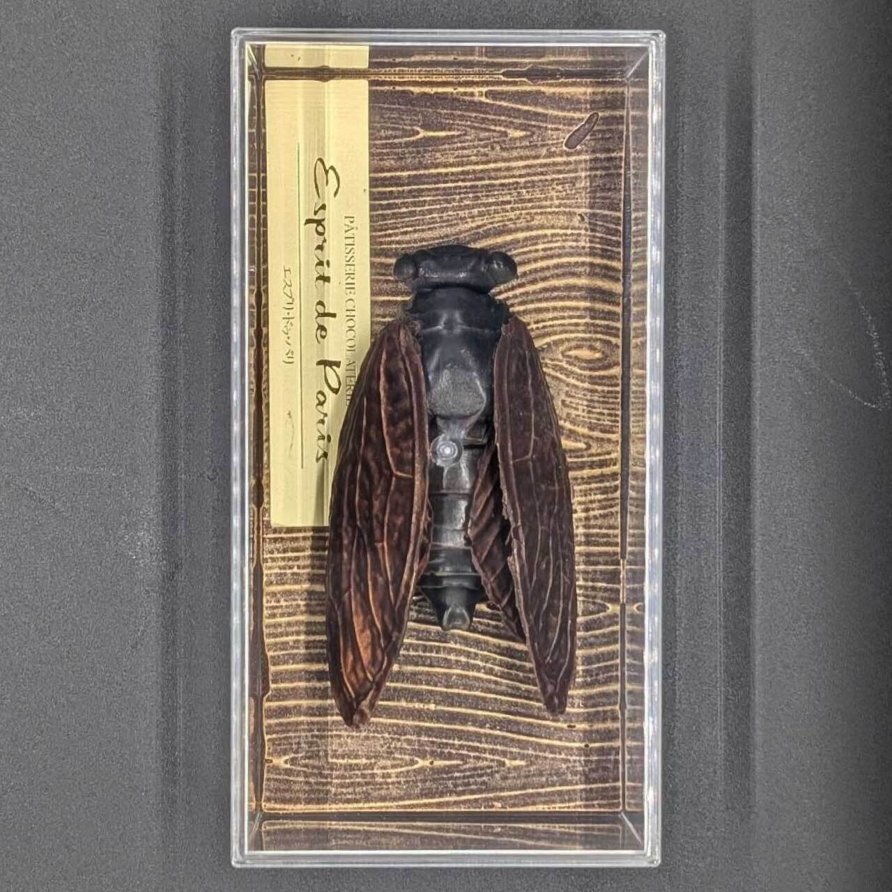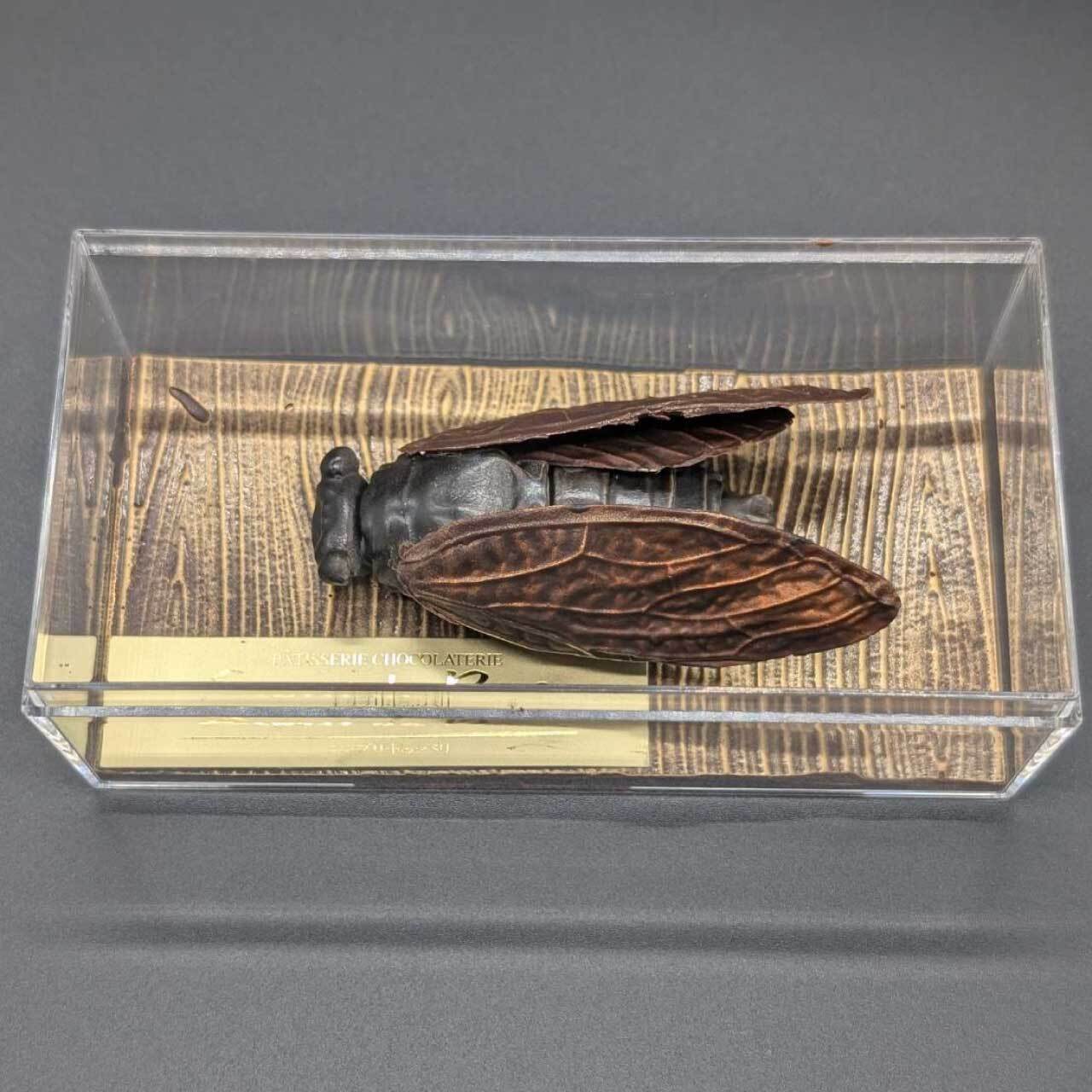 木の上でミンミンと鳴くアブラゼミを、そのまま精密に再現したチョコレートアート。